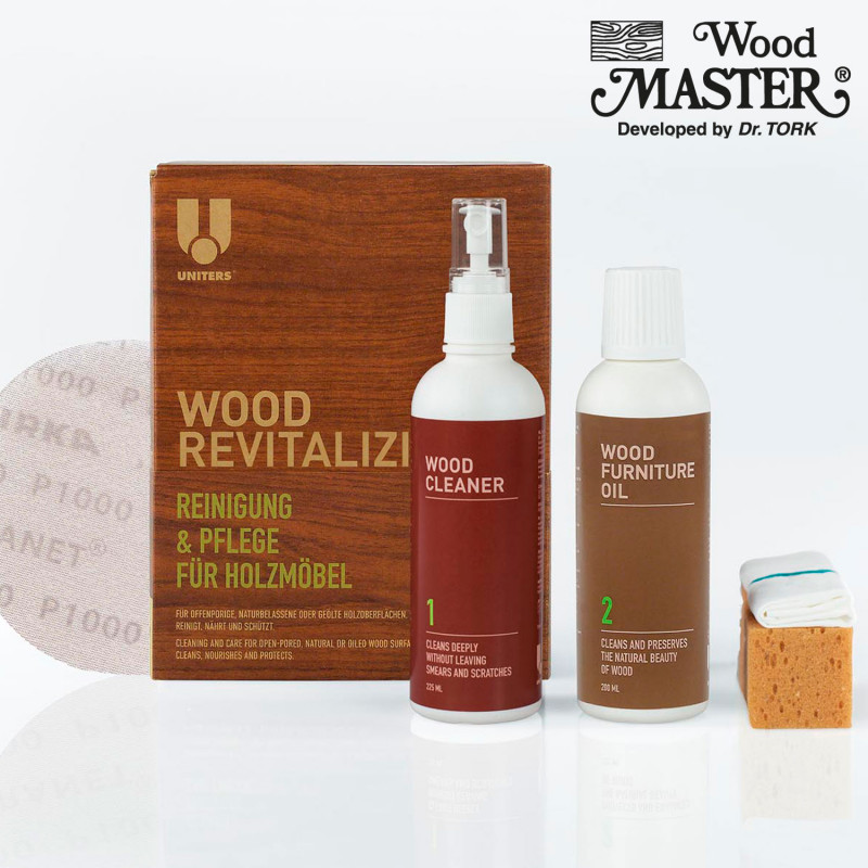 Pflegeset für Reinigung, Schutz und Pflege von unlackierten Holzoberflächen. Dieses Set enthält alle Produkte zur Pflege und Auffrischung von unlackiertem Massivholz. Ein spezielles Schleifpad erleichtert zusätzlich die Entfernung von aufgequollenen Fasern bei Eichenholz. Für alle Massivholzoberflächen geeignet. Der Wood Cleaner reinigt gründlich und porentief, ohne zu schmirgeln oder zu kratzen. Das Wood Oil Holzpflegeöl nährt und pflegt unbehandeltes, offenporiges Holz mit natürlichen Ölen.